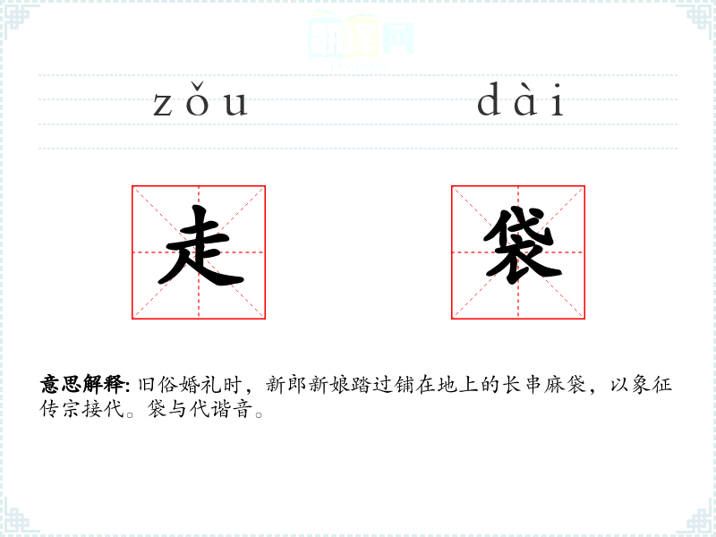 旧俗婚礼时,新郎新娘踏过铺在地上的长串麻袋,以象征