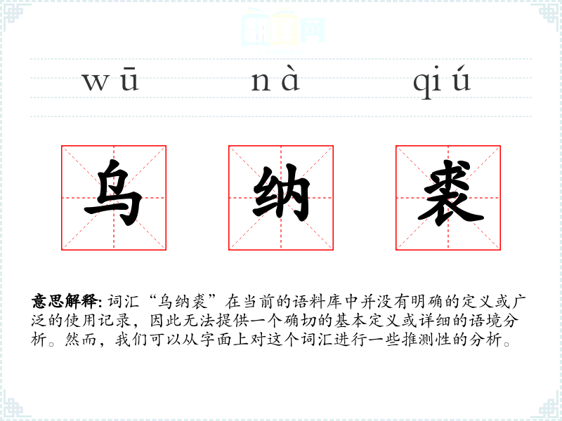 词汇“乌纳裘”在当前的语料库中并没有明确的定义或广泛的使用记录,因此无法提供一个确切的基本定义或详细的语境分析。然而,我们可以从字面上对这个词汇进行一些推测性的分析。