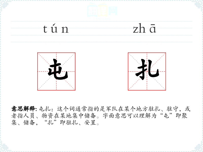 屯扎:这个词通常指的是军队在某个地方驻扎、驻守,或者指人员、物资在某地集中储备。字面意思可以理解为“屯”即聚集、储备,“扎”即驻扎、安置。