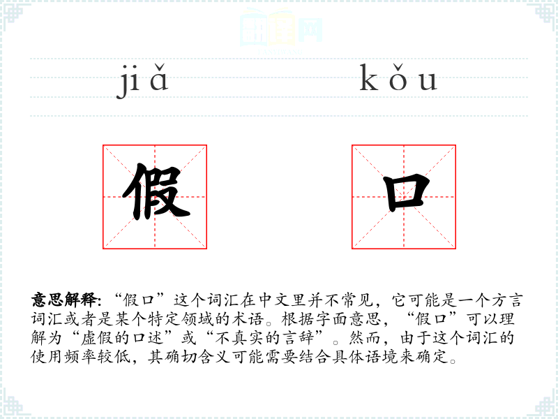由于“假口”不是一个标准汉语词汇,它在不同语境下的使用可能非常有限。在某些方言中,它可能指代某种特定的虚假表达方式。在专业领域,如法律或医学,它可能指代某种特定的虚假陈述或不真实的报告。