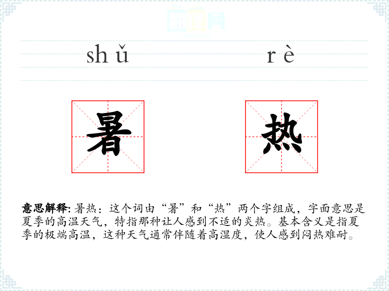 暑热:这个词由“暑”和“热”两个字组成,字面意思是夏季的高温天气,特指那种让人感到不适的炎热。基本含义是指夏季的极端高温,这种天气通常伴随着高湿度,使人感到闷热难耐。
