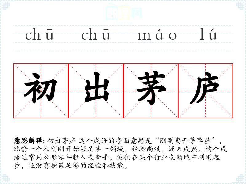 初出茅庐 这个成语的字面意思是“刚刚离开茅草屋”,比喻一个人刚刚开始涉足某一领域,经验尚浅,还未成熟。这个成语通常用来形容年轻人或新手,他们在某个行业或领域中刚刚起步,还没有积累足够的经验和技能。