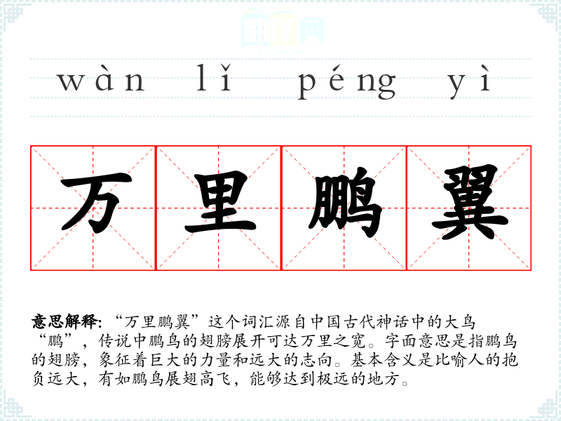 “万里鹏翼”源自《庄子·逍遥游》中的描述,其中提到鹏鸟“抟扶摇而上者九万里”,后来这个词汇被广泛用于文学和日常语言中,用以形容人的远大志向和能力。