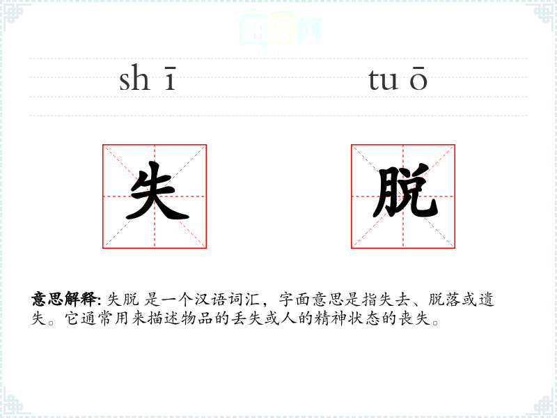 - 文学:在文学作品中,“失脱”可能用来形容人物的某种特质或情感的丧失,如“他的纯真在社会的磨砺中失脱了。”