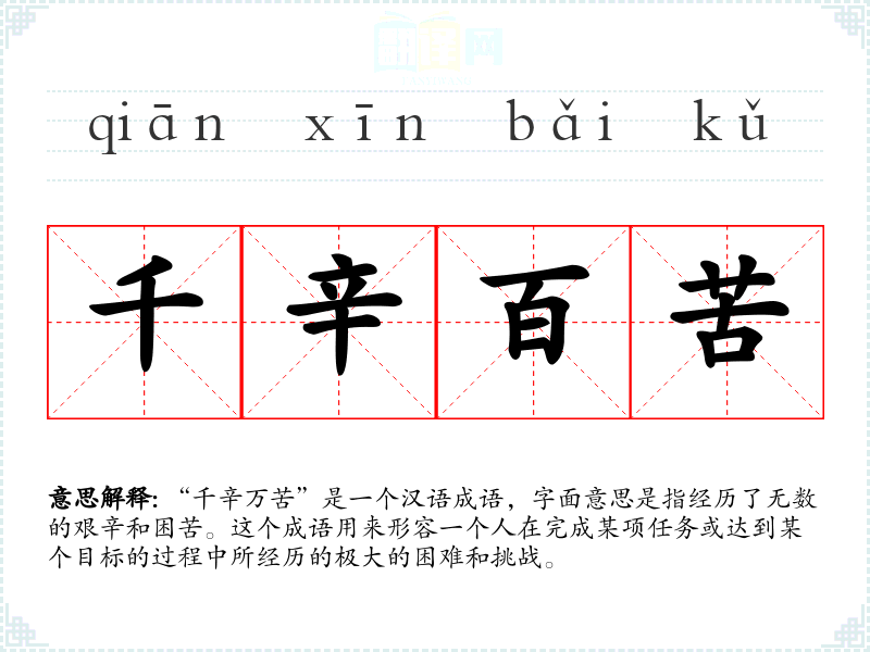 “千辛万苦”这个成语的词源较为古老,其构成体现了汉语成语的典型特点,即通过数字和形容词的叠加来强调程度的深重。在历史演变中,这个成语的使用逐渐固定,成为表达极大困难的常用语。