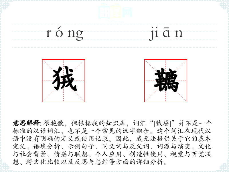 很抱歉,但根据我的知识库,词汇“[狨屉]”并不是一个标准的汉语词汇,也不是一个常见的汉字组合。这个词汇在现代汉语中没有明确的定义或使用记录。因此,我无法提供关于它的基本定义、语境分析、示例句子、同义词与反义词、词源与演变、文化与社会背景、情感与联想、个人应用、创造性使用、视觉与听觉联想、跨文化比较以及反思与总结等方面的详细分析。