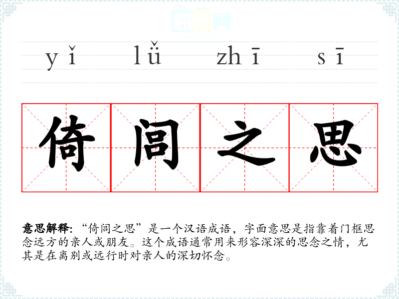 “倚闾之思”是一个汉语成语,字面意思是指靠着门框思念远方的亲人或朋友。这个成语通常用来形容深深的思念之情,尤其是在离别或远行时对亲人的深切怀念。