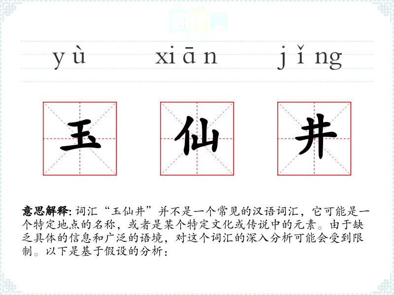 词汇“玉仙井”并不是一个常见的汉语词汇,它可能是一个特定地点的名称,或者是某个特定文化或传说中的元素。由于缺乏具体的信息和广泛的语境,对这个词汇的深入分析可能会受到限制。以下是基于假设的分析: