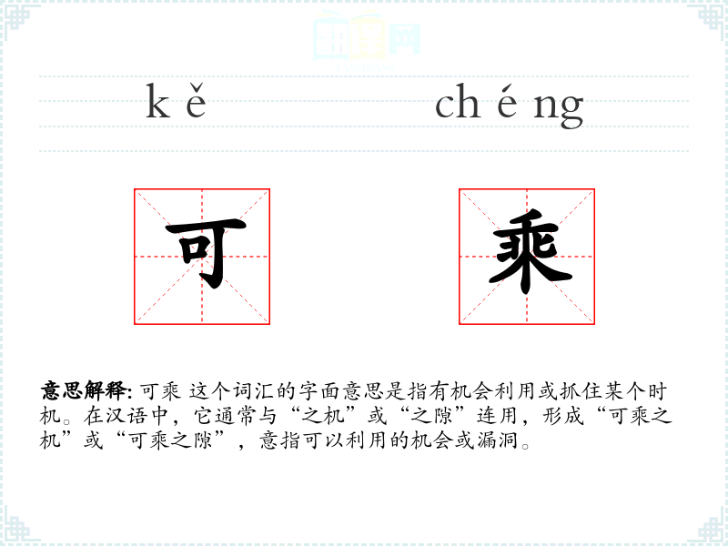 - 口语:在日常对话中,“可乘”可能用于建议或提醒某人抓住机会,如“现在是个可乘之机,你应该考虑投资。”