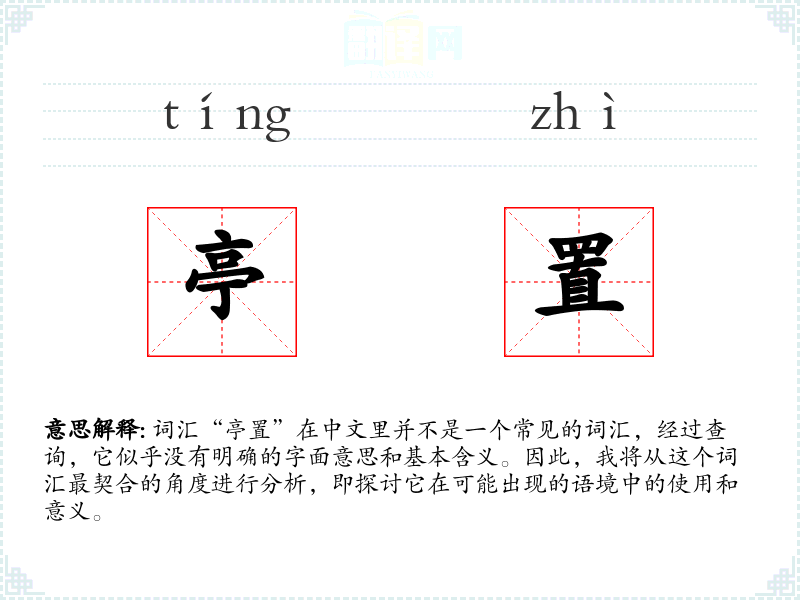 由于“亭置”不是一个标准词汇,我们无法给出一个确切的基本定义。它可能是某个特定领域或方言中的词汇,或者是某个特定文献中的用语。