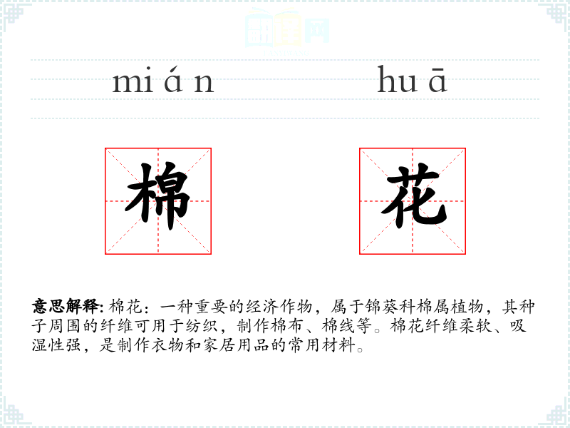 棉花:一种重要的经济作物,属于锦葵科棉属植物,其种子周围的纤维可用于纺织,制作棉布、棉线等。棉花纤维柔软、吸湿性强,是制作衣物和家居用品的常用材料。