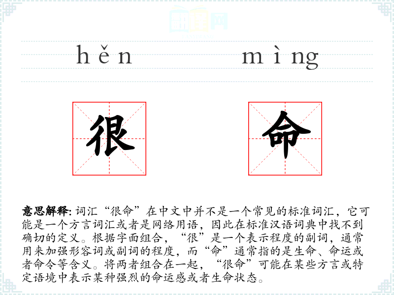 词汇“很命”在中文中并不是一个常见的标准词汇,它可能是一个方言词汇或者是网络用语,因此在标准汉语词典中找不到确切的定义。根据字面组合,“很”是一个表示程度的副词,通常用来加强形容词或副词的程度,而“命”通常指的是生命、命运或者命令等含义。将两者组合在一起,“很命”可能在某些方言或特定语境中表示某种强烈的命运感或者生命状态。