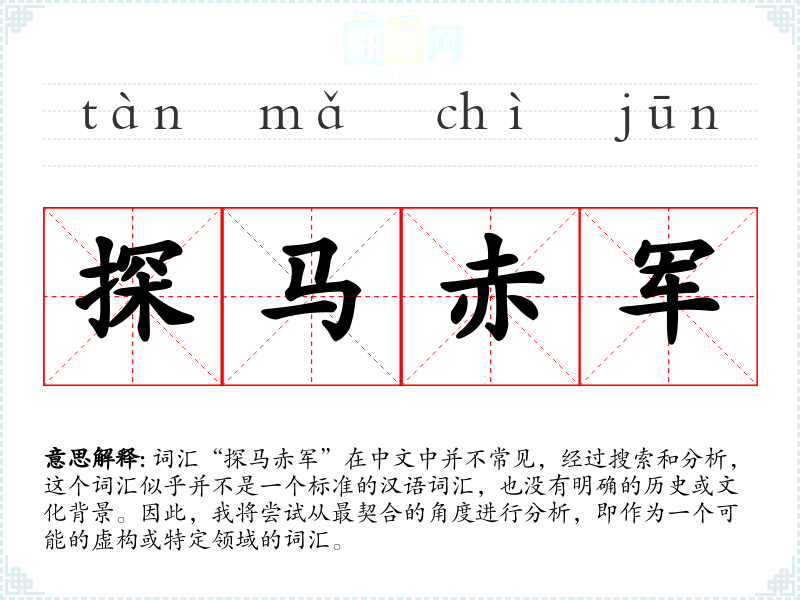 词汇“探马赤军”在中文中并不常见,经过搜索和分析,这个词汇似乎并不是一个标准的汉语词汇,也没有明确的历史或文化背景。因此,我将尝试从最契合的角度进行分析,即作为一个可能的虚构或特定领域的词汇。