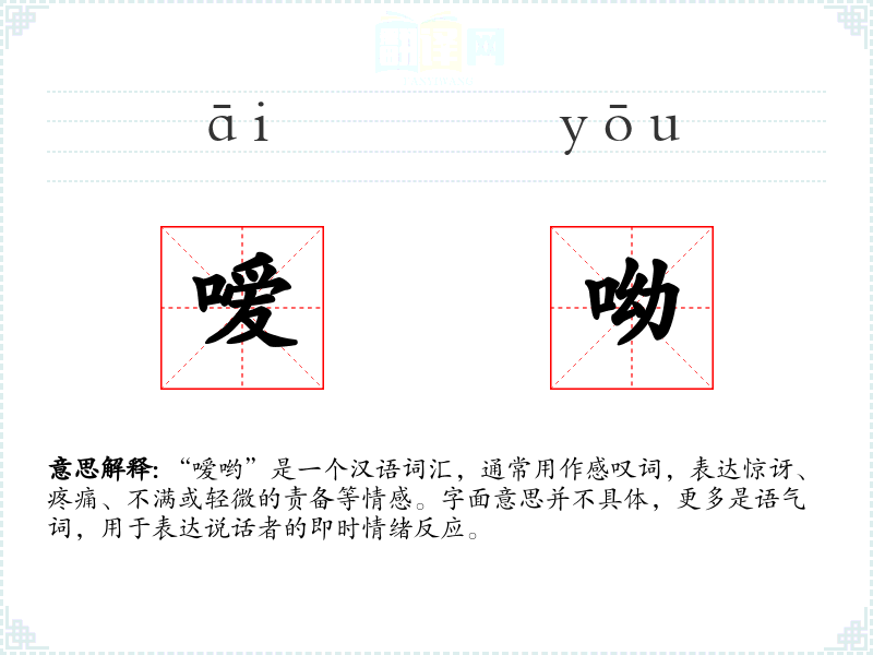 - 反义词:无特定反义词,因为“嗳哟”是情感表达,不涉及逻辑上的对立。