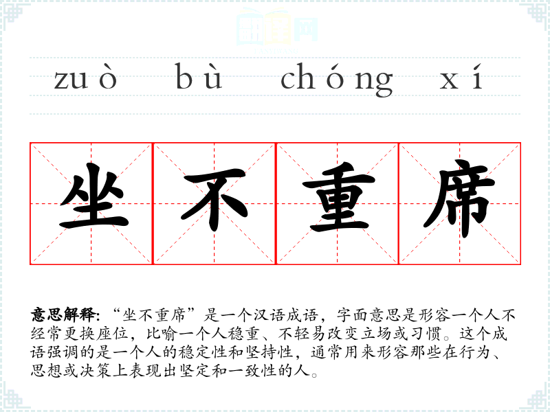在英语中,类似的表达可能是“stick to one's guns”,意思是指坚持自己的观点或立场,不轻易改变。这个表达也强调了坚持和一致性,但与“坐不重席”相比,它更多地用于描述在争论或冲突中的坚持。