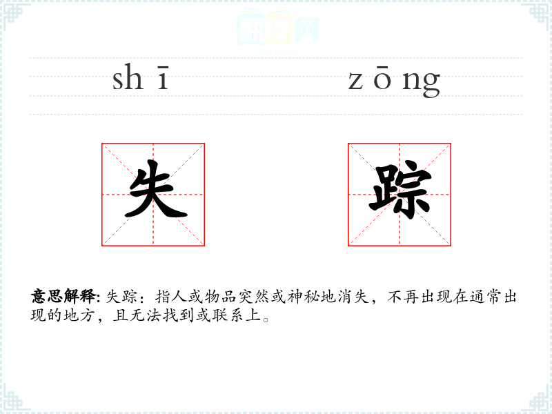 “失踪”一词由“失”和“踪”组成,“失”表示失去,“踪”表示踪迹或行踪。在古代汉语中,“失踪”可能用“失迹”或“失影”来表达类似意思。随着语言的发展,“失踪”成为更常用的表达方式。