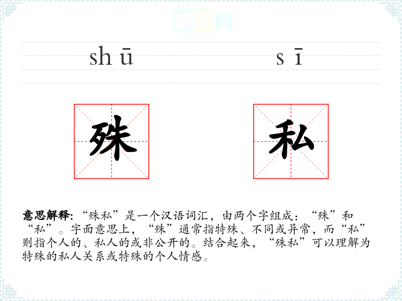 “殊私”作为一个复合词,其构成部分“殊”和“私”在古代汉语中已有使用。随着时间的推移,这两个字结合在一起,形成了描述特殊私人关系的词汇。