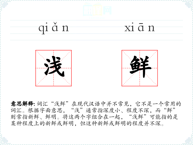 在特定的文化或社会背景中,“浅鲜”可能被用来形容某种特定的审美或情感状态,但这需要具体的语境来确定。
