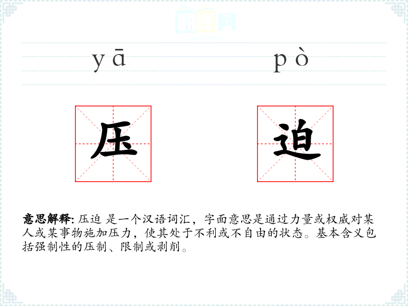 压迫 是一个汉语词汇,字面意思是通过力量或权威对某人或某事物施加压力,使其处于不利或不自由的状态。基本含义包括强制性的压制、限制或剥削。