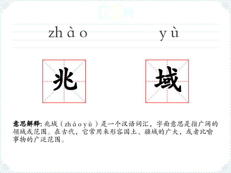 兆域(zhào yù)是一个汉语词汇,字面意思是指广阔的领域或范围。在古代,它常用来形容国土、疆域的广大,或者比喻事物的广泛范围。