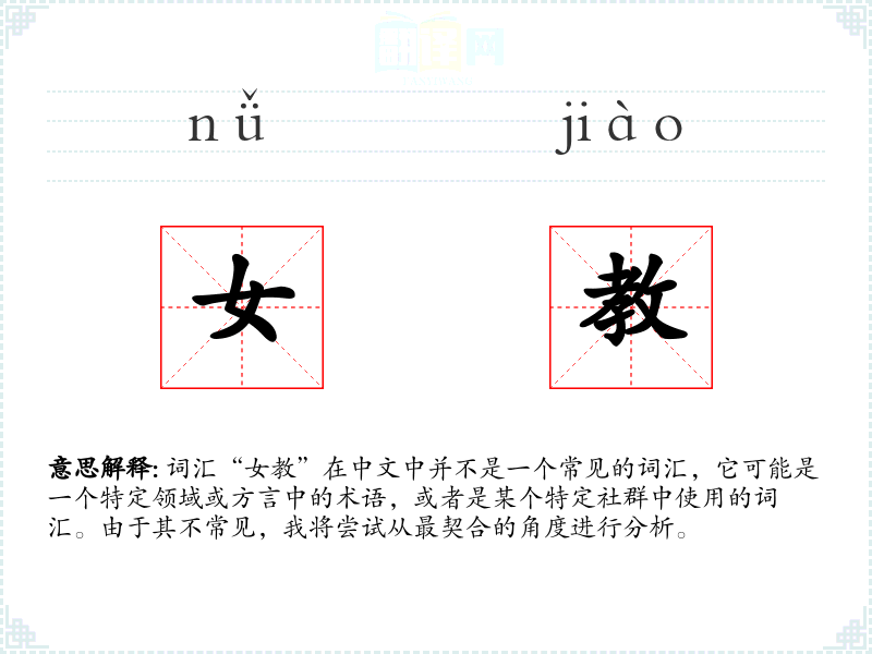 由于“女教”不是一个标准词汇,它在不同语境下的使用可能非常有限。在某些特定的社群或方言中,它可能指代某种特定的女性教育方式或内容。