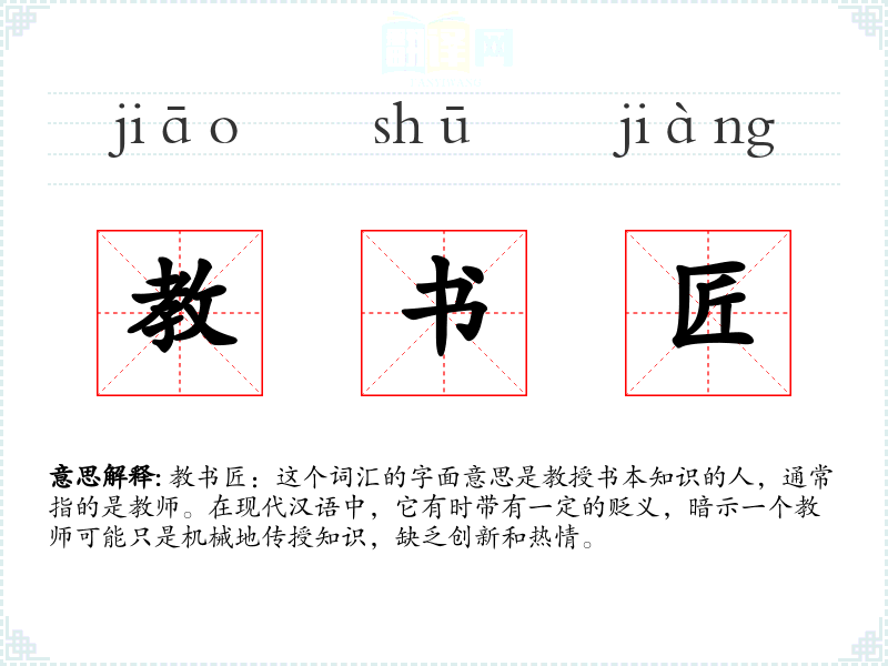 教书匠:这个词汇的字面意思是教授书本知识的人,通常指的是教师。在现代汉语中,它有时带有一定的贬义,暗示一个教师可能只是机械地传授知识,缺乏创新和热情。