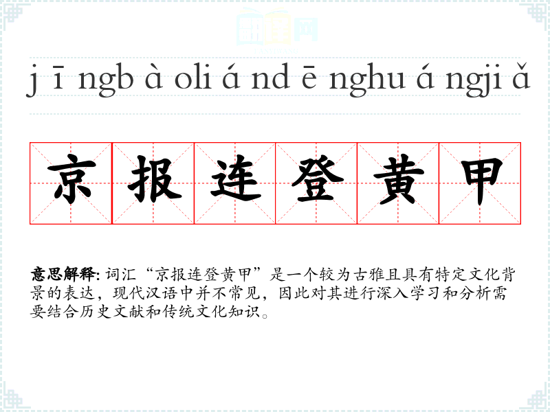 词汇“京报连登黄甲”是一个较为古雅且具有特定文化背景的表达,现代汉语中并不常见,因此对其进行深入学*和分析需要结合历史文献和传统文化知识。