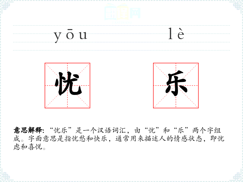 “忧乐”是一个汉语词汇,由“忧”和“乐”两个字组成。字面意思是指忧愁和快乐,通常用来描述人的情感状态,即忧虑和喜悦。