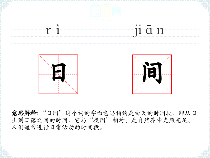 - 专业领域:在气象学或天文学中,“日间”可能特指太阳在地平线以上的时间段。