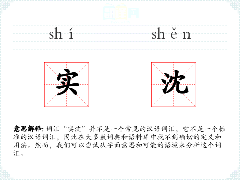 词汇“实沈”并不是一个常见的汉语词汇,它不是一个标准的汉语词汇,因此在大多数词典和语料库中找不到确切的定义和用法。然而,我们可以尝试从字面意思和可能的语境来分析这个词汇。