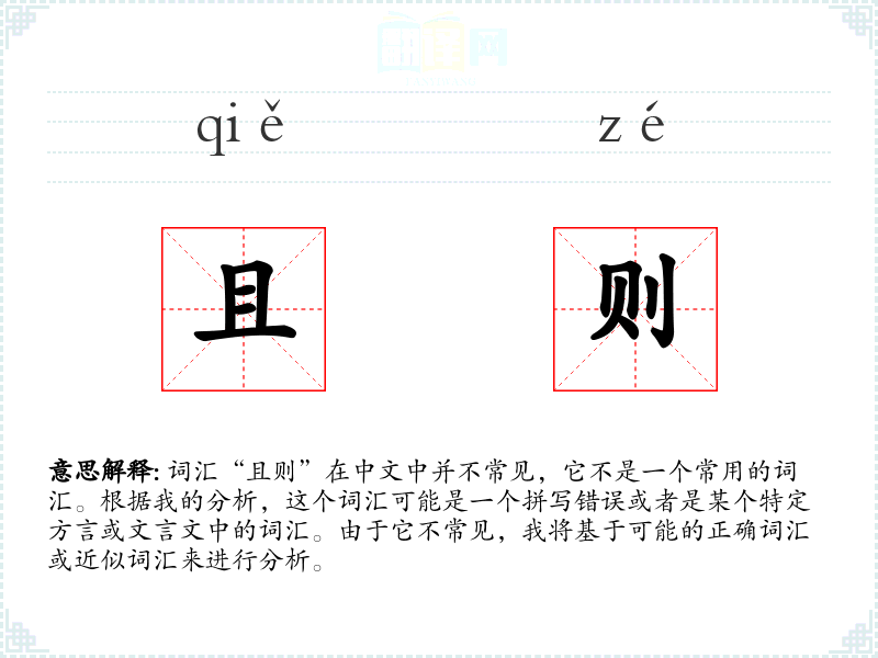 词汇“且则”在中文中并不常见,它不是一个常用的词汇。根据我的分析,这个词汇可能是一个拼写错误或者是某个特定方言或文言文中的词汇。由于它不常见,我将基于可能的正确词汇或近似词汇来进行分析。