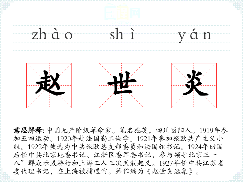1.中国无产阶级革命家。笔名施英,四川酉阳人。1919年参加五四运动。1920年赴法国勤工俭学。1921年参加旅欧共产主义小组。1922年被选为中共旅欧总支部委员和法国组书记。1924年回国后任中共北京地委书记、江浙区委军委书记,参与领导北京三一八”群众示威游行和上海工人三次武装起义。1927年任中共江苏省委代理书记,在上海被捕遇害。著作编为《赵世炎选集》。