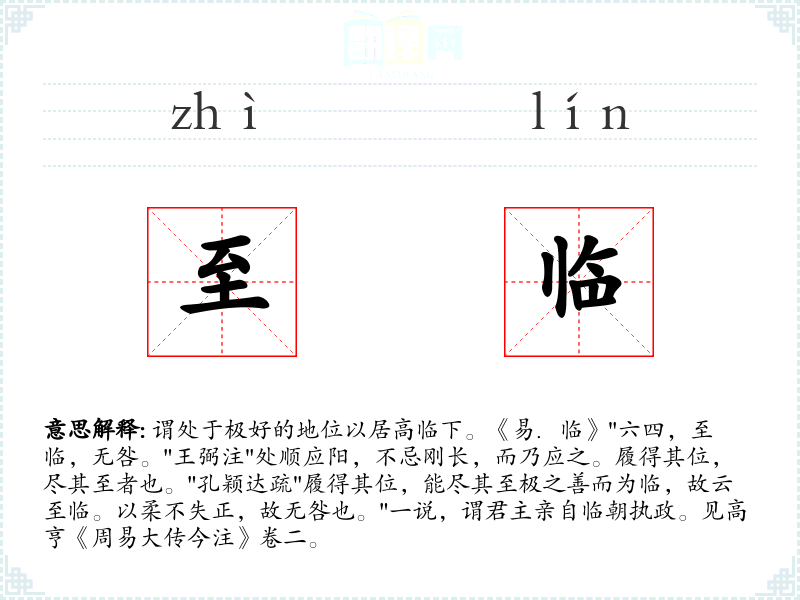 1.谓处于极好的地位以居高临下。《易.临》"六四,至临,无咎。"王弼注"处顺应阳,不忌刚长,而乃应之。履得其位,尽其至者也。"孔颖达疏"履得其位,能尽其至极之善而为临,故云至临。以柔不失正,故无咎也。"一说,谓君主亲自临朝执政。见高亨《周易大传今注》卷二。