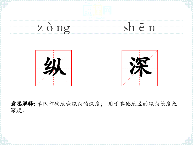 军队作战地域纵向的深度; 用于其他地区的纵向长度或深度。