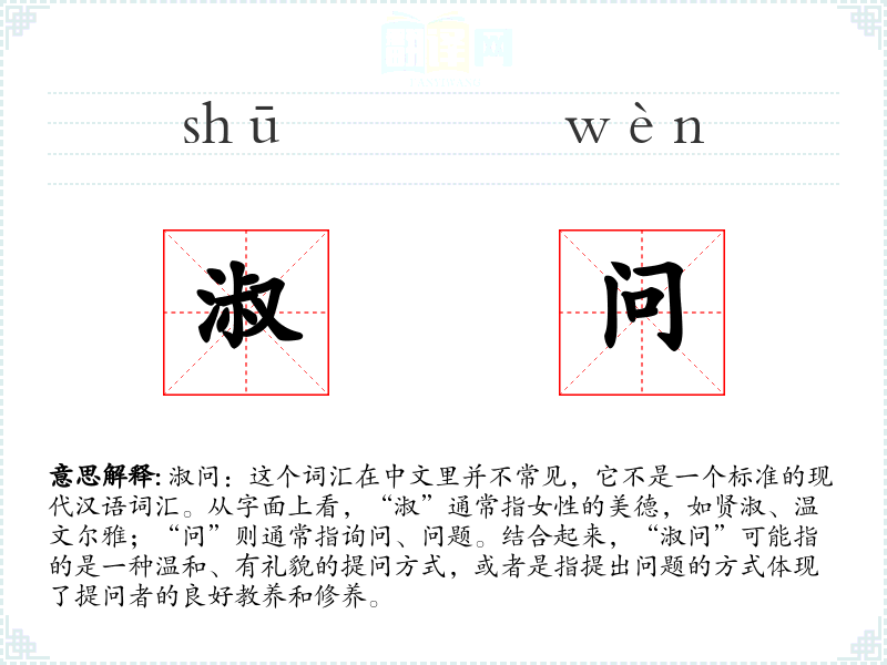 由于“淑问”不是一个常用词汇,它在现代文学、口语或专业领域中很少出现。如果出现,可能是在描述一种提问的艺术,强调提问的方式和态度,而不是问题的内容本身。