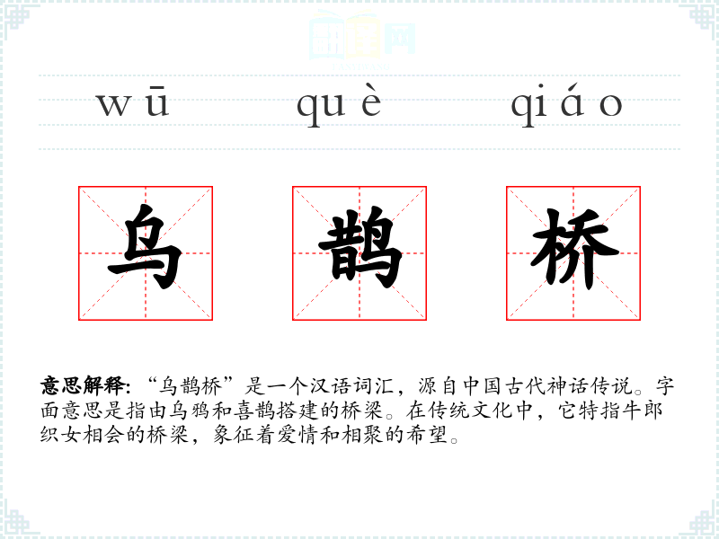 “乌鹊桥”是一个汉语词汇,源自**古代神话传说。字面意思是指由乌鸦和喜鹊搭建的桥梁。在传统文化中,它特指牛郎织女相会的桥梁,象征着爱情和相聚的希望。
