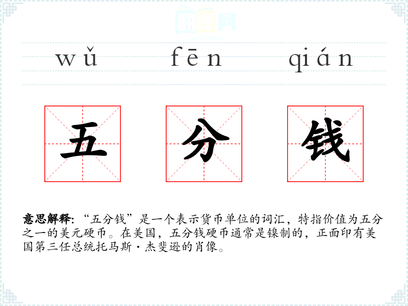 “五分钱”是一个表示货币单位的词汇,特指价值为五分之一的美元硬币。在美国,五分钱硬币通常是镍制的,正面印有美国第三任总统托马斯·杰斐逊的肖像。