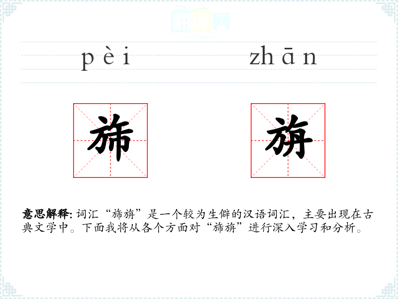 “旆旃”(pèi zhān)在古代汉语中指的是旗帜的边缘装饰,尤其是指旗帜的下垂部分。它由两个字组成,“旆”指的是旗帜的边缘,“旃”则是指一种细软的织物,常用来形容旗帜的质地。