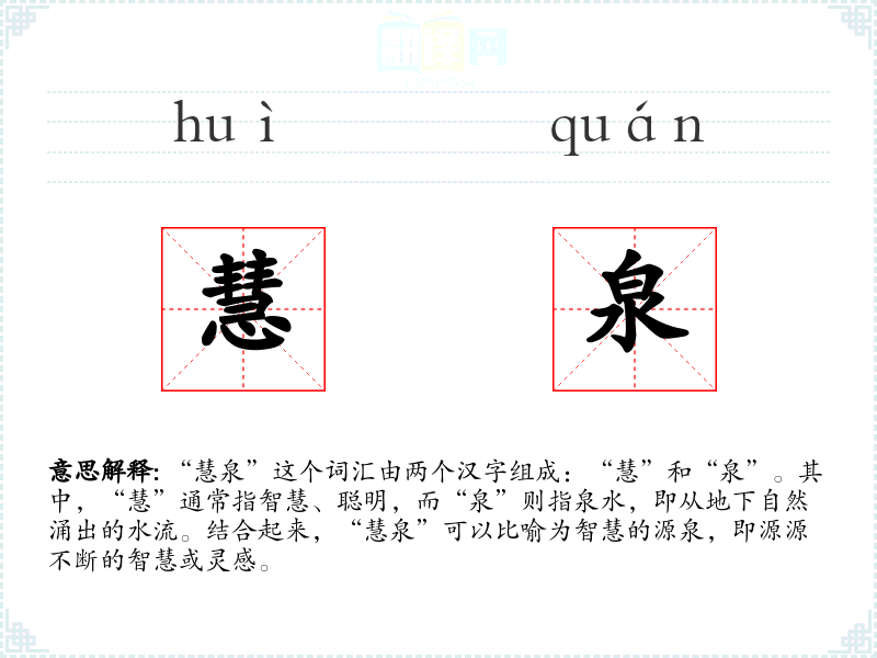“慧”字在古代汉语中已有智慧的含义,而“泉”字则一直指泉水。这两个字的组合在古代文献中并不常见,但在现代汉语中,由于其比喻意义的美好和深刻,逐渐被用于各种文学和专业文本中。