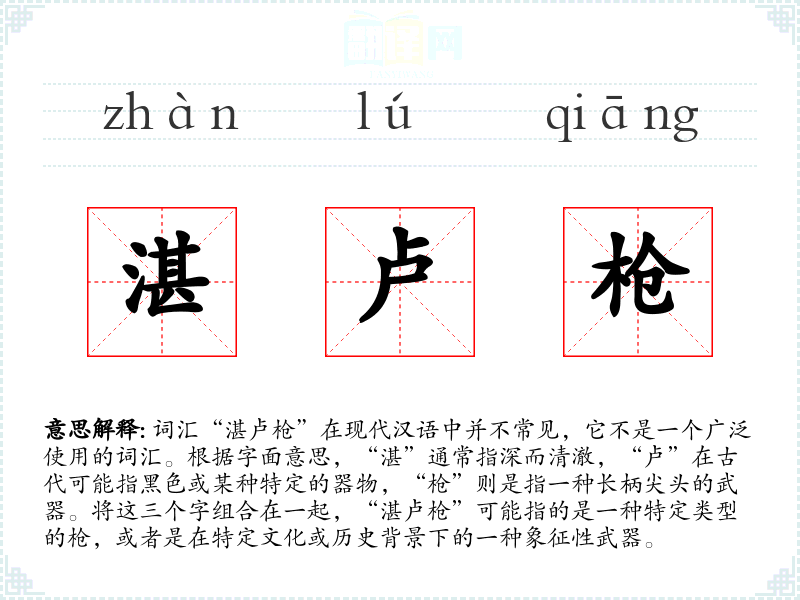 - 理解:湛卢枪是一个具有特定文化背景和象征意义的词汇,虽然在现代汉语中不常见,但在文学和历史研究中可能仍有其价值。