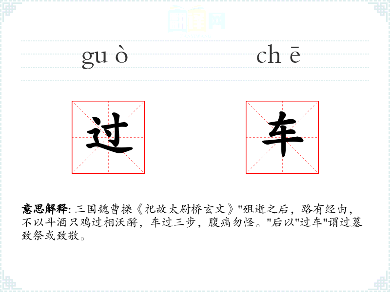 三国魏曹操《祀故太尉桥玄文》"殂逝之后,路有经由,不以斗酒只鸡过相沃酹,车过三步,腹痛勿怪。"后以"过车"谓过墓致祭或致敬。