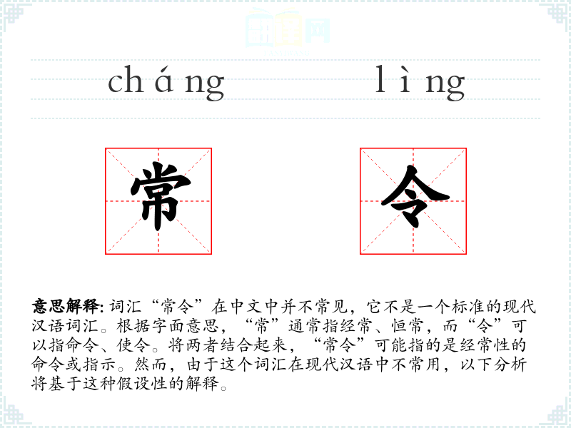 词汇“常令”在中文中并不常见,它不是一个标准的现代汉语词汇。根据字面意思,“常”通常指经常、恒常,而“令”可以指命令、使令。将两者结合起来,“常令”可能指的是经常性的命令或指示。然而,由于这个词汇在现代汉语中不常用,以下分析将基于这种假设性的解释。
