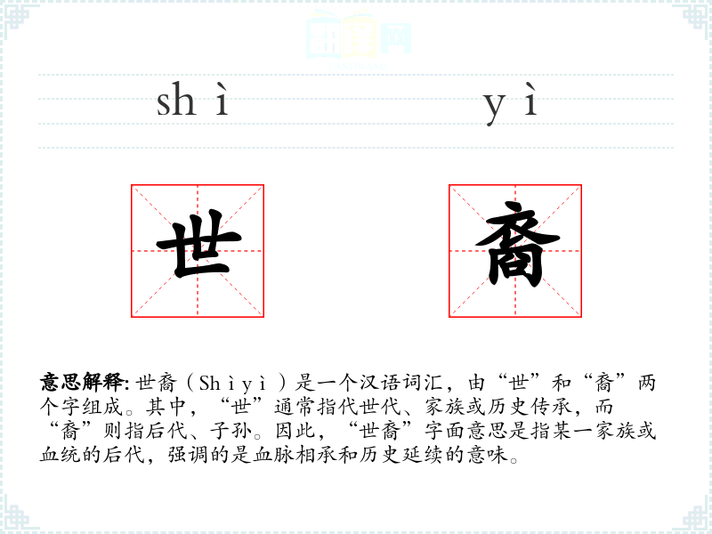 世裔(Shìyì)是一个汉语词汇,由“世”和“裔”两个字组成。其中,“世”通常指代世代、家族或历史传承,而“裔”则指后代、子孙。因此,“世裔”字面意思是指某一家族或血统的后代,强调的是血脉相承和历史延续的意味。