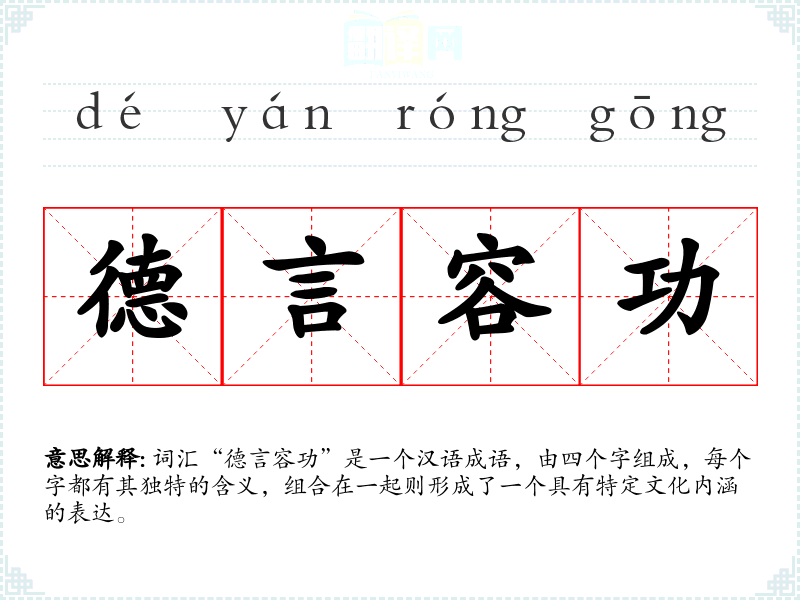 词汇“德言容功”是一个汉语成语,由四个字组成,每个字都有其独特的含义,组合在一起则形成了一个具有特定文化内涵的表达。