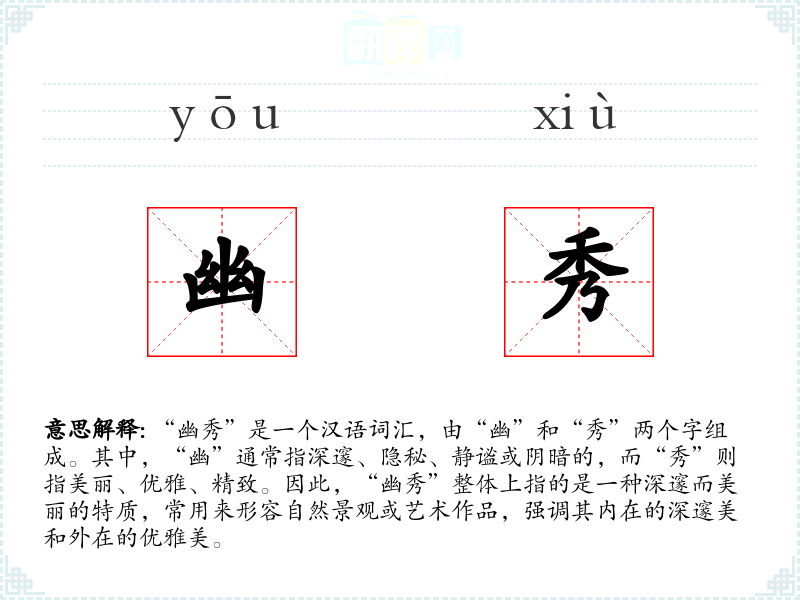 “幽秀”这个词的词源较为直接,由“幽”和“秀”两个字组合而成。在古代汉语中,“幽”和“秀”都有各自的使用历史,而“幽秀”作为一个复合词,可能在宋代以后的文学作品中逐渐流行起来,用以形容那些深邃而美丽的自然景观或艺术作品。