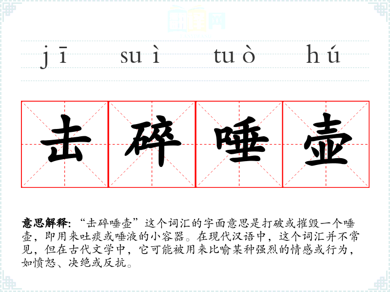 “击碎唾壶”这个词汇的字面意思是打破或摧毁一个唾壶,即用来吐痰或唾液的小容器。在现代汉语中,这个词汇并不常见,但在古代文学中,它可能被用来比喻某种强烈的情感或行为,如愤怒、决绝或反抗。