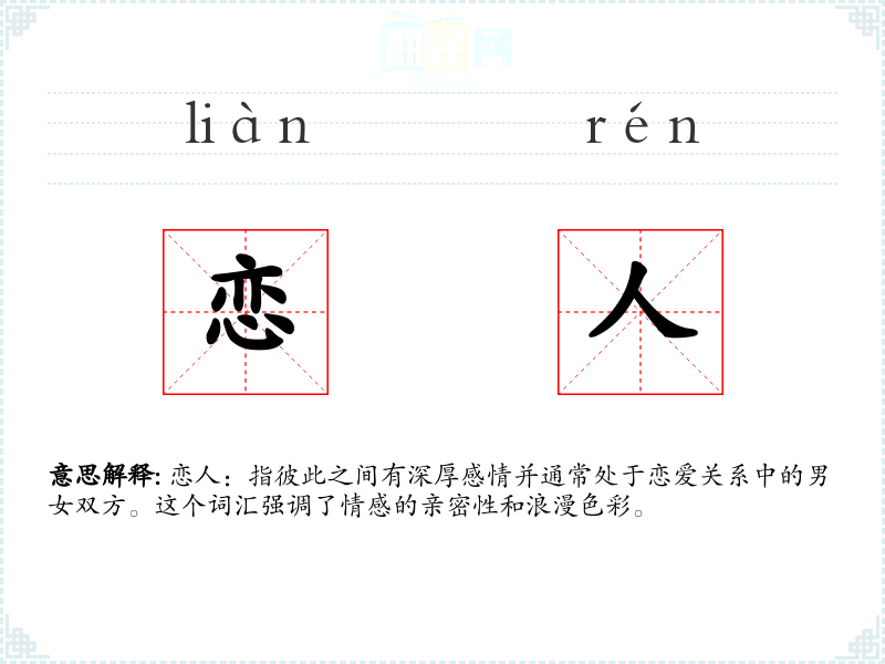 恋人:指彼此之间有深厚感情并通常处于恋爱关系中的男女双方。这个词汇强调了情感的亲密性和浪漫色彩。