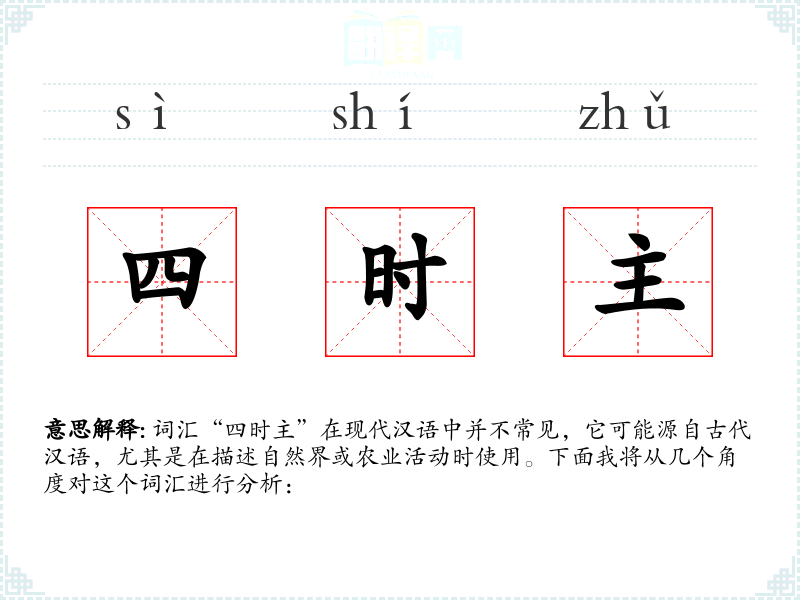 词汇“四时主”在现代汉语中并不常见,它可能源自古代汉语,尤其是在描述自然界或农业活动时使用。下面我将从几个角度对这个词汇进行分析: