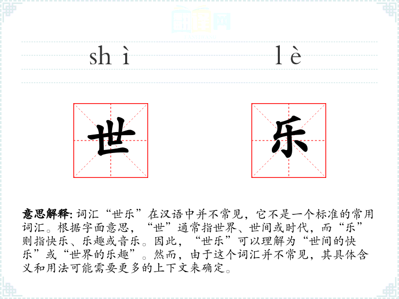 由于“世乐”不是一个常用词汇,其在不同语言或文化中的对应词汇可能不太明确。在某些文化中,可能会有类似的词汇或概念来表达普遍的快乐或幸福。