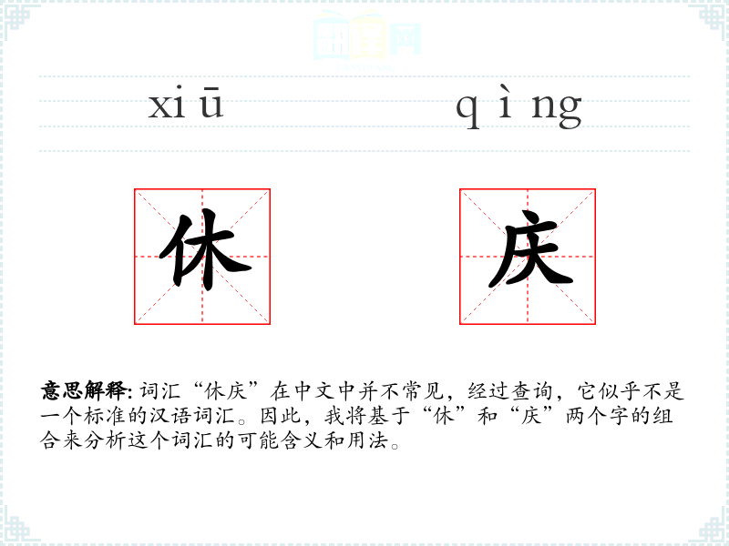 词汇“休庆”在中文中并不常见,经过查询,它似乎不是一个标准的汉语词汇。因此,我将基于“休”和“庆”两个字的组合来分析这个词汇的可能含义和用法。